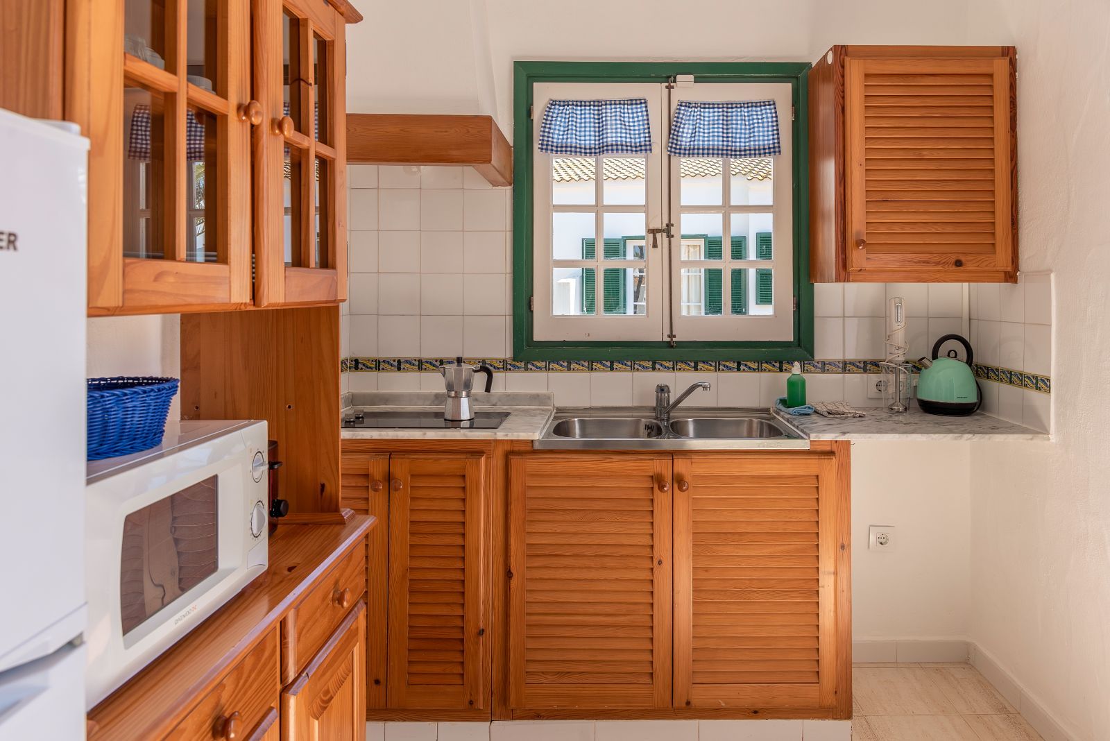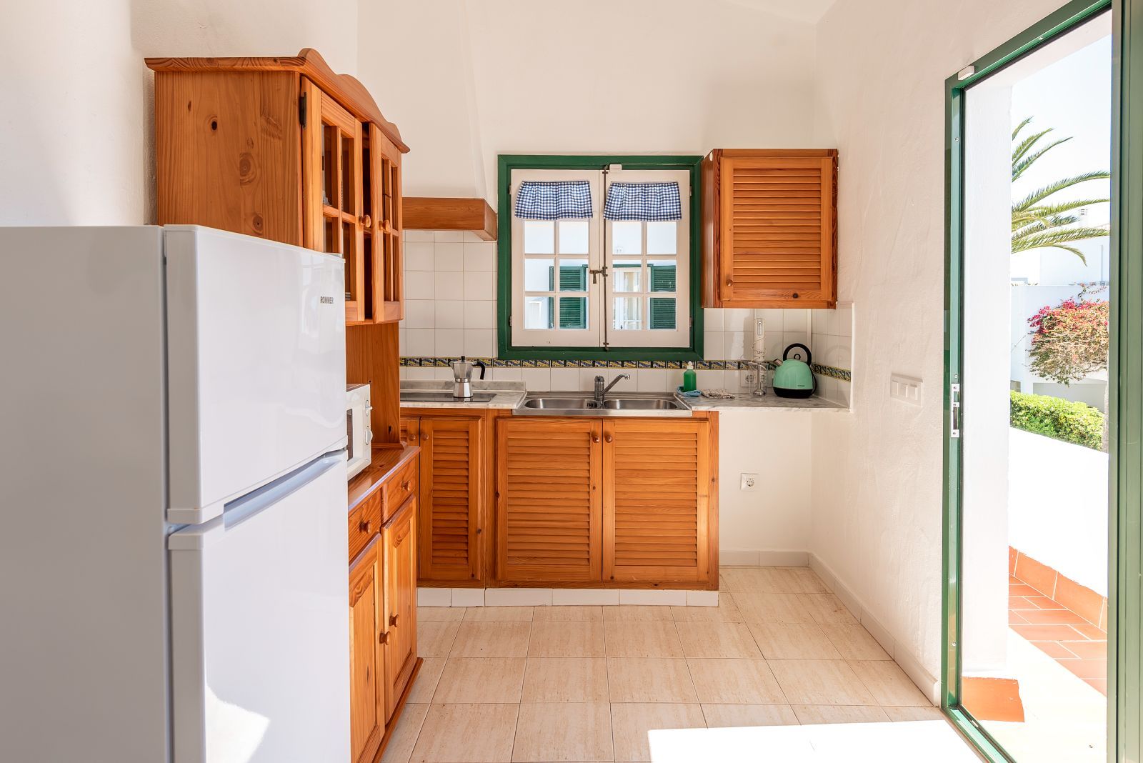 El salón-comedor cuenta con una pequeña cocina integrada, completamente equipada con microondas, cafetera, tostador, hervidor eléctrico, batidora... vitro de dos fuegos y nevera alta con congelador.