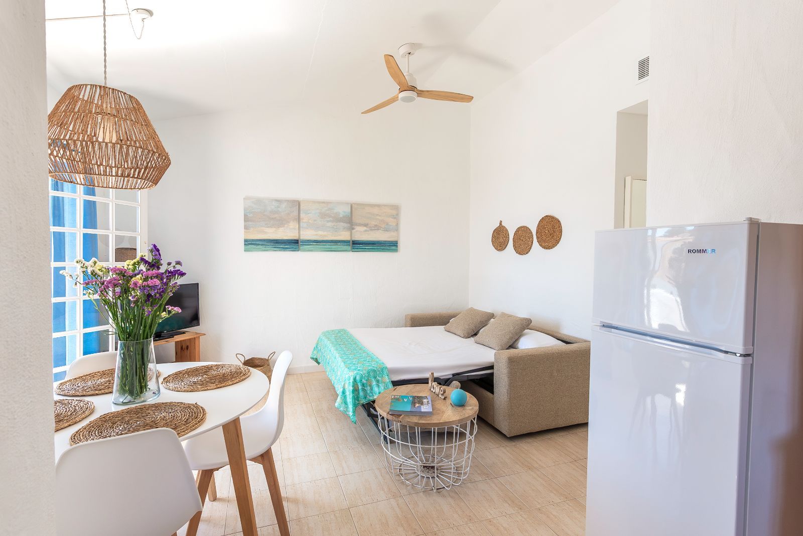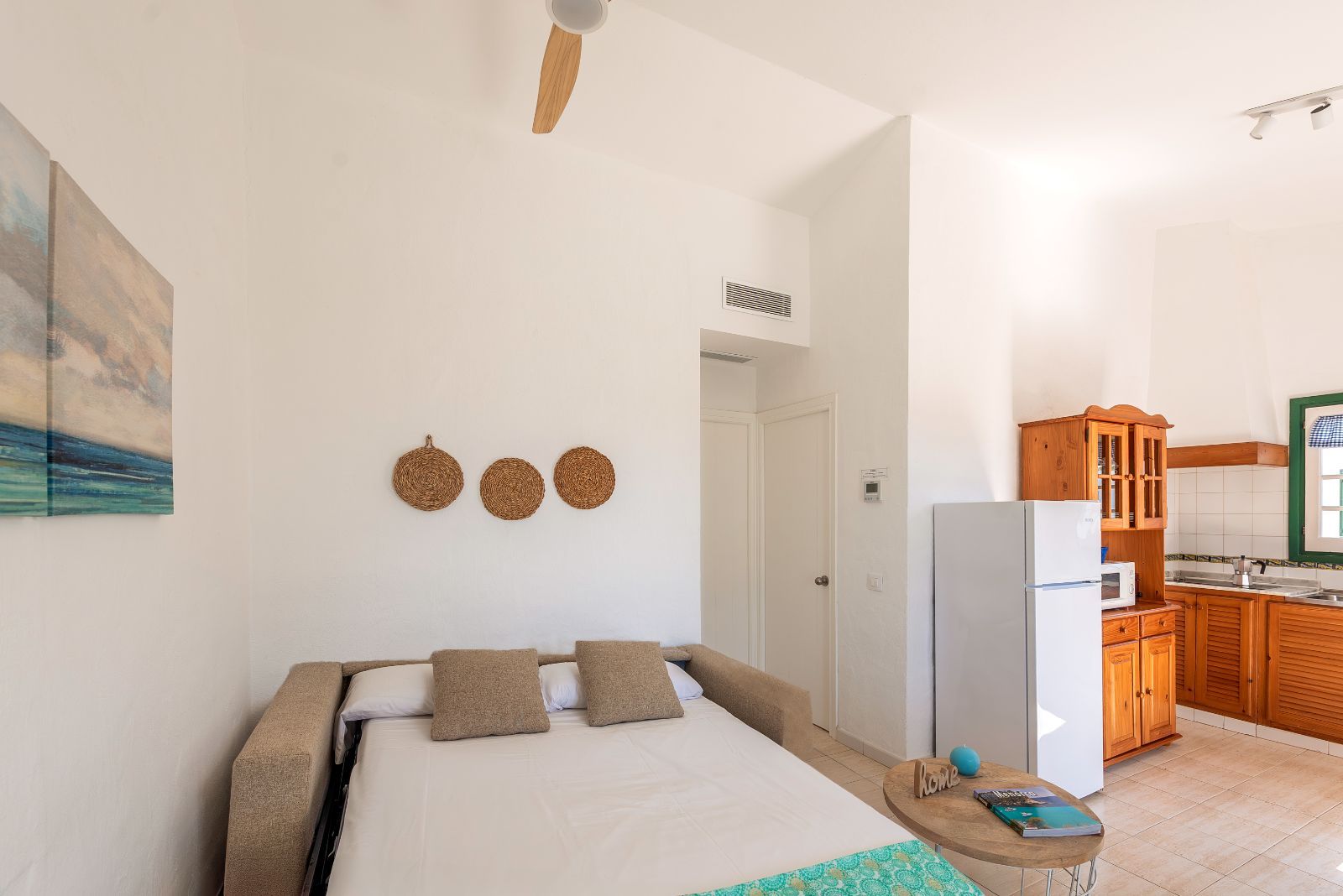 Tiene aire acondicionado integrado, lo que asegura una agradable temperatura en cada rincón. Además, tanto en el salón como en el dormitorio, encontrarás ventiladores de techo para disfrutar de una brisa suave y refrescante.